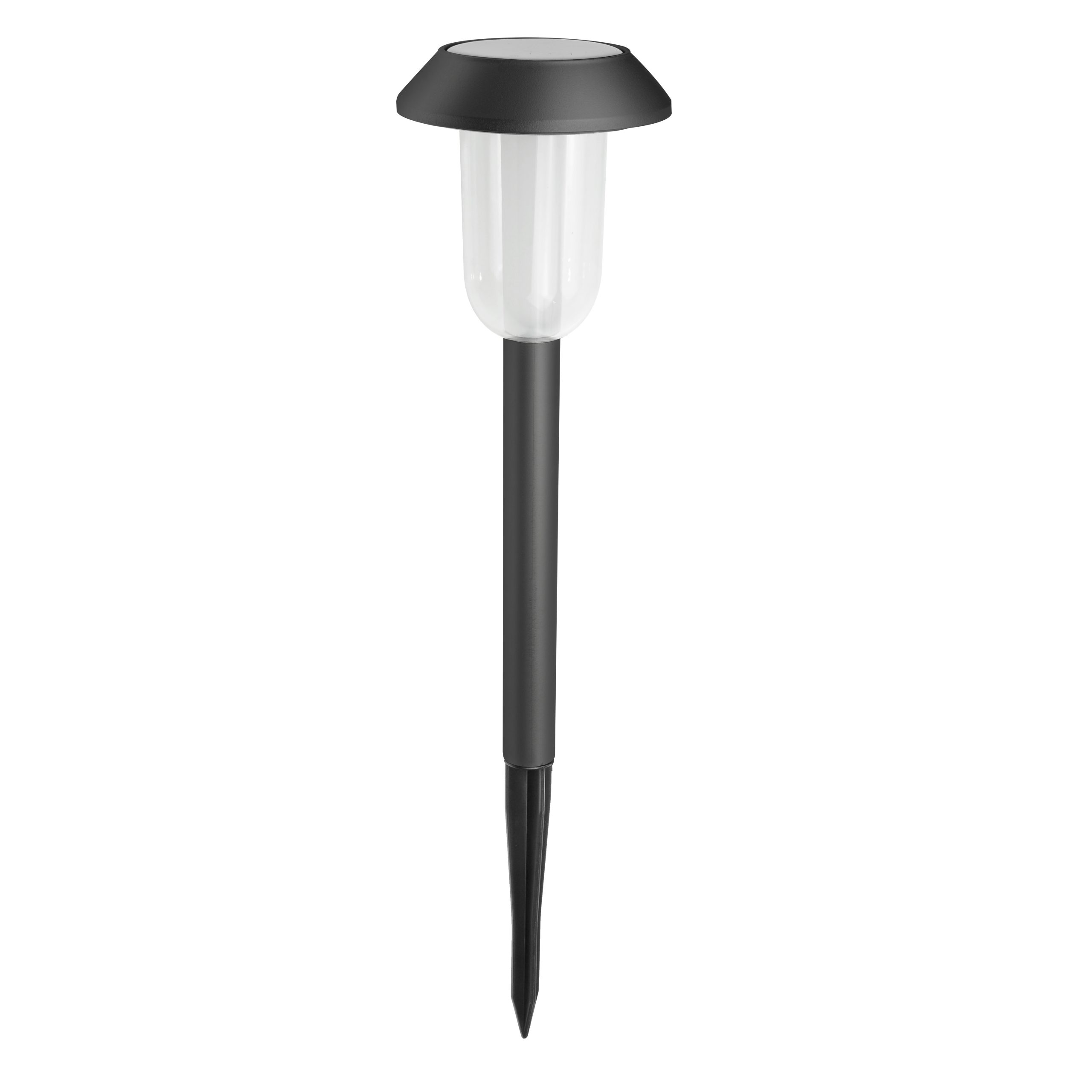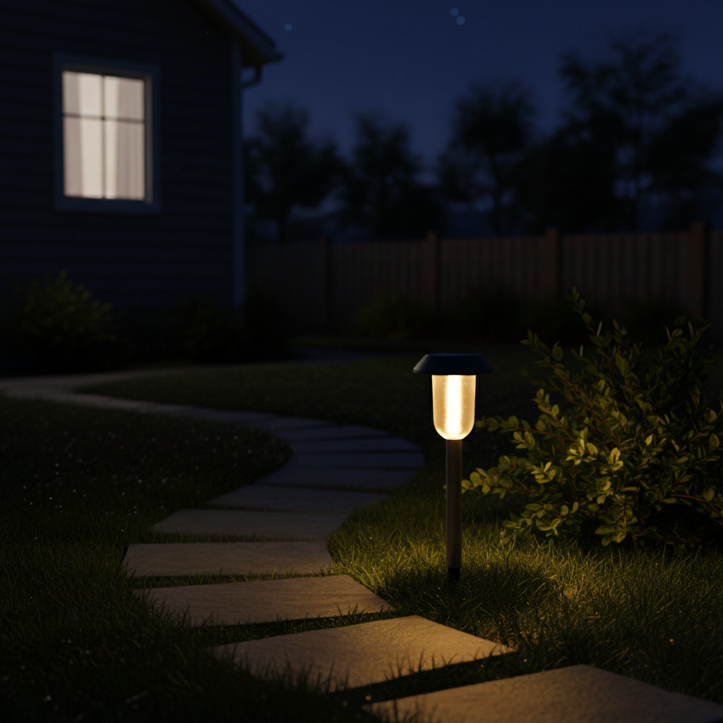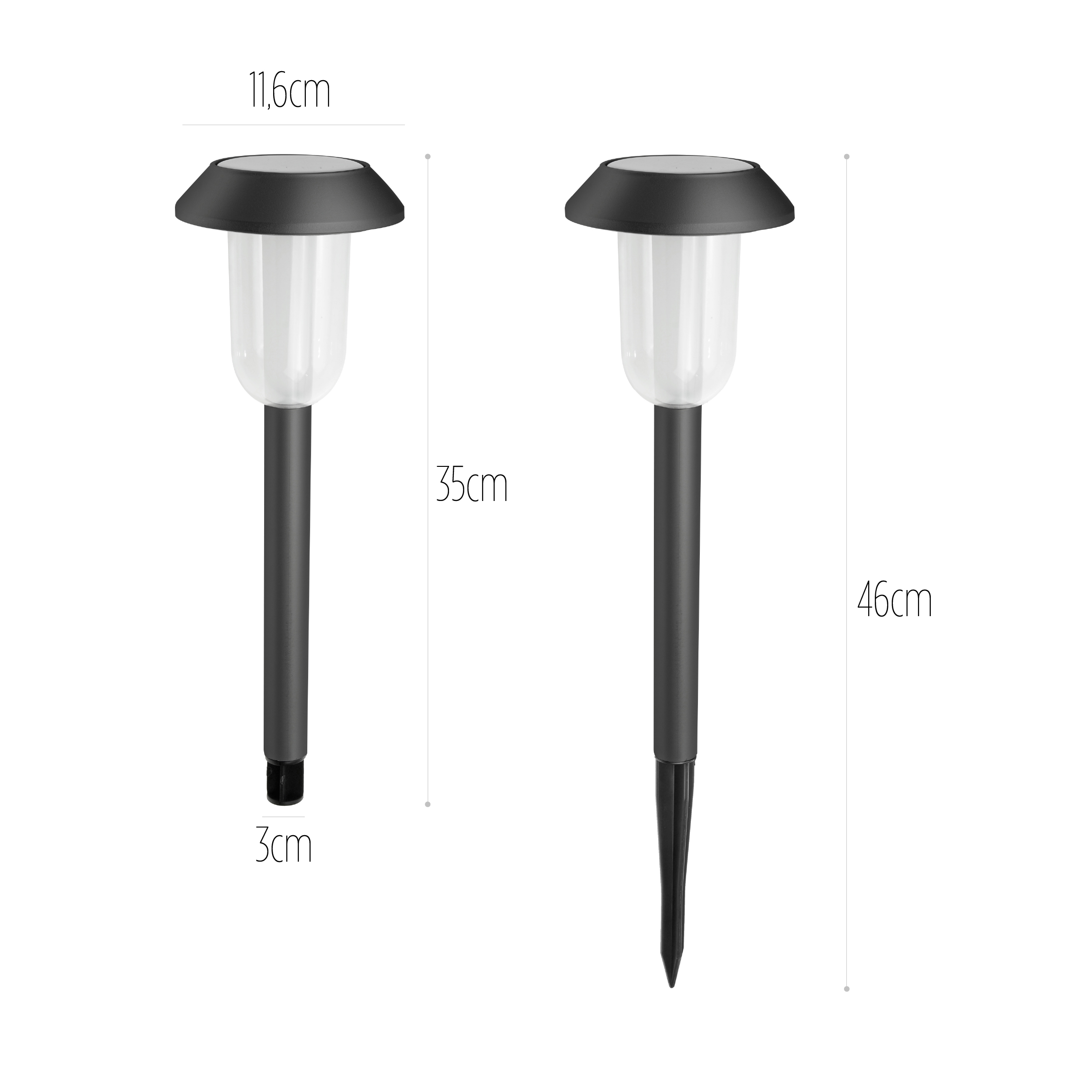 Estaca solar para decorar tu jardín. Su luz cálida de 2800K crea una atmósfera relajante ideal para noches al aire libre, destacando plantas, macizos y caminos con un brillo suave y agradable. Gracias a su panel solar cristalino de alta eficiencia y batería recargable NI-MH, proporciona hasta 8 horas de iluminación continua, sin cables ni consumo eléctrico.